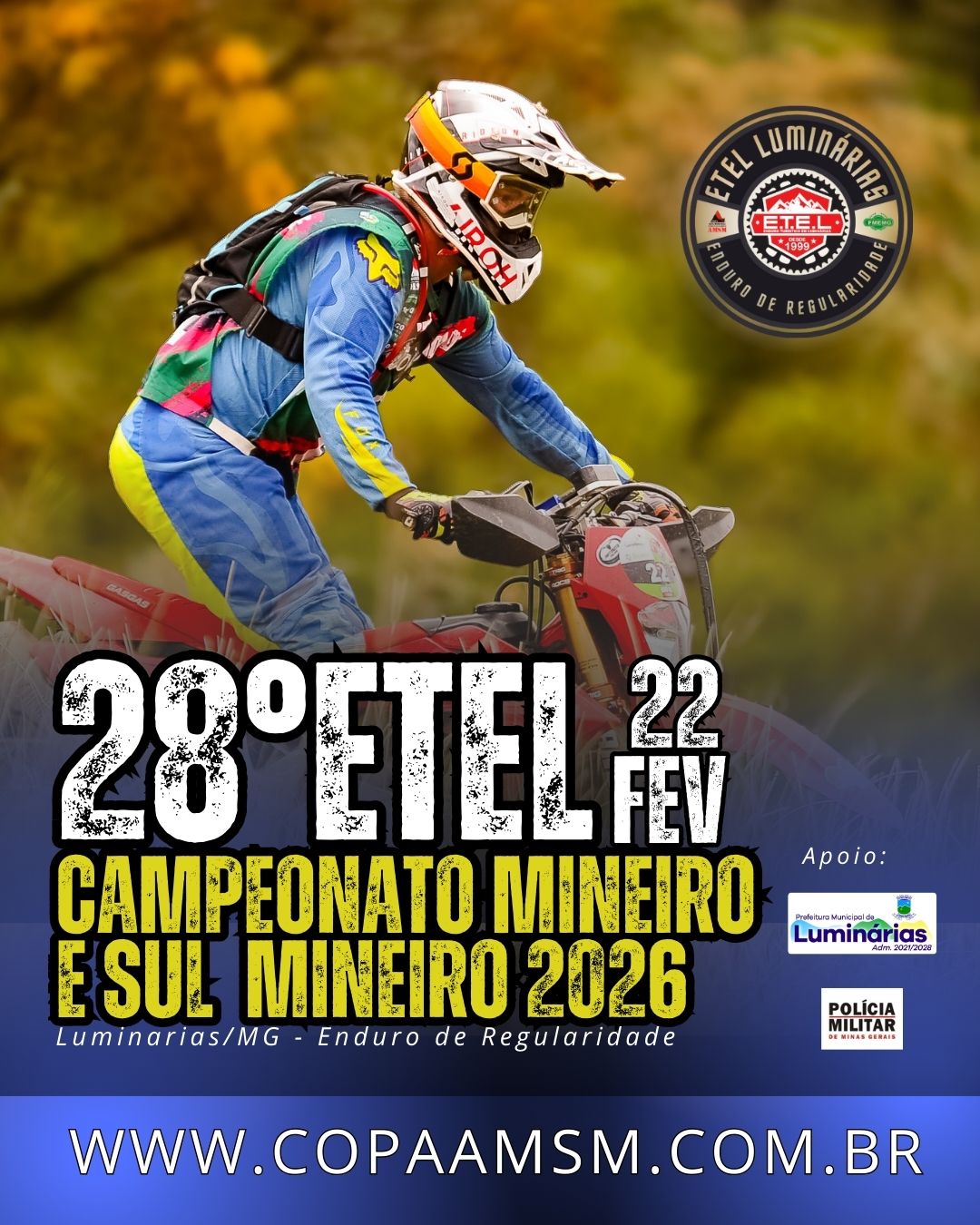 Luminárias/MG sediará, no dia 08 de fevereiro de 2026, o 28º ETEL Luminárias, prova que marca a abertura oficial do Campeonato Mineiro e do Campeonato Sul-Mineiro de Enduro de Regularidade 2026. O evento integra o calendário da Copa AMSM, considerada uma das competições mais técnicas e bem organizadas da modalidade no país.